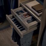 De complete inrichting van de binnenkant is door Poliform ontworpen om de ruimte zo persoonlijk mogelijk in te delen. De structuur en de inrichting van het Senzafine-systeem is verkrijgbaar in diverse melamine afwerkingen. Melamine kan eenvoudig schoongemaakt worden, is eenvoudig in het onderhoud, sterk tegen vuil en krassen en garandeert stevigheid en betrouwbaarheid op de lange termijn. Het systeem biedt maatwerkoplossingen: aanpassingen in breedte, hoogte en diepte, horizontale en verticale passtroken, veranderingen in diepte, brugconstructies voor doorbouw boven deuren en eindoplossingen. Met dit Poliform-systeem lost u situaties voor hoekconstructies het beste op.