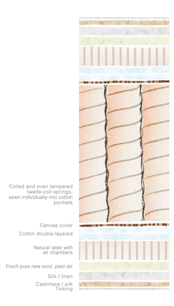 Wat de Schramm Grand Cru matras bijzonder maakt, is de zorgvuldig opgebouwde comfortlaag van uitsluitend natuurlijke materialen. De kern bestaat uit 100% natuurlatex, een materiaal dat zich perfect aanpast aan de contouren van het lichaam en drukverlagend werkt. Deze latex wordt aan de bovenzijde luxueus afgewerkt met een gelaagde toplaag van Franse schaapscheerwol, een mix van zijde en linnen en een combinatie van kasjmier en zijde. Deze natuurlijke vezels zorgen niet alleen voor een aangenaam zacht ligcomfort, maar ook voor een uitstekende vochtregulatie en temperatuurbeheersing, essentieel voor een gezonde nachtrust.